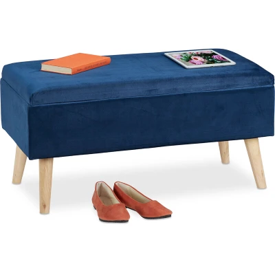 Relaxdays Ottoman Storage Bench, Velvet Upholstery, 40l Capacity, Padded, Wooden Legs, Seating Furniture, Dark Blue, 50% fibreboard 30% Wood 20%, 80 x 40 41 cm