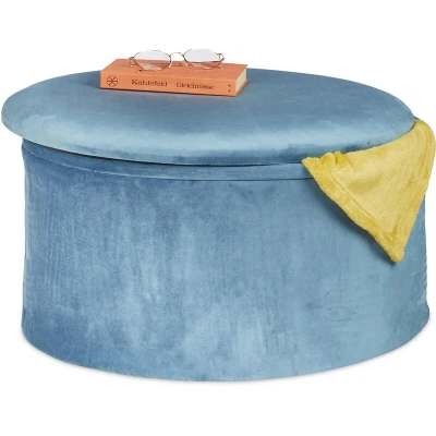Relaxdays Ottoman with Storage Space, Foldable, Upholstered, Round Velvet Stool, HxØ: 31 x 57 cm, Petrol Blue, Fibreboard