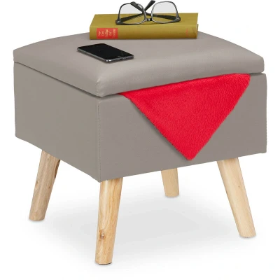 The stool with storage space is the clever 2-in-1 solution for the living room, hallway and other living areas. You can store magazines, remote control and other everyday items in the inner compartment. The upholstered seat makes for a comfortable sitting experience. The stool also cuts a fine figure as a practical footstool in front of the couch or armchair. The storage stool impresses with its decorative interplay of wooden legs and imitation leather cover. Stool in detail - Dimensions H x W x D: approx. 40 x 40 x 40 cm - Interior dimensions H x W x D: approx. 15 x 35.5 x 35.5 cm - Load capacity: max. 120 kg - Weight: approx. 7 kg - Material: Wood, imitation leather, foam, MDF - In various colours Elegant upholstered stool with cover - Can be used as a stool, footrest or shelf - Additional storage space for toys, catalogues etc. - Attractive in hallway, living room, guest room and bedroom - Rubber foot pads protect the floor from scratches - Sturdy material and elegant design in