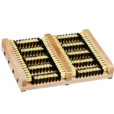 General description You can use this practical wooden mat to clean your shoes after a walk with your dog or after a hard day’s work in the garden. The robust plastic brushes, anchored on sturdy wooden boards, polish your shoes from underneath and sideways, simply by rolling your feet forward and backward. The special rubber struts placed at the bottom of the shoe cleaner prevent slipping and protect your floor from scratches. Your shoes will receive the right treatment anywhere - whether on the balcony, at the home entrance, on the terrace, or in the garden. Technical specifications Size H x W x D: approx. 5.5 x 36 x 26 cm Surface for one shoe W x D: approx. 11 x 24 cm Material: Wood, PVC Weight: approx. 1.1 kg Colour: Natural with black and yellow bristles Other information Included in Delivery: 1 x Shoe brush outdoor mat Decorative items shown in product pictures are not included