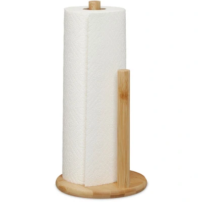 Relaxdays Paper Towel Roll Holder, Bamboo, Stainless Steel, Kitchen Rack with a Stopper, HxØ: 28x14.5 cm, Natural