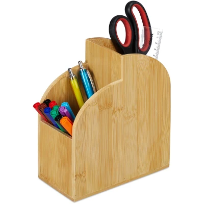 Relaxdays Pen Holder, Desk Organiser for Office and Home, Stationery Brushes Storage, HWD 20x17x9 cm, Bamboo, Brown