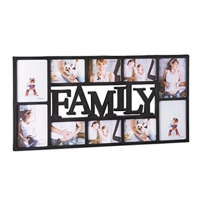 Down memory lane: Thanks to this picture frame for 10 photos, you can always look back on great moments you’ve had with your family and friends - Available in black Decorative: With this picture gallery, you can create an individual collage of photos and drawings - The word “Family” is firmly integrated into the frame Easy to use: Small clips are keeping the back panels in place - Simply turn, lift up the panel and insert your photos - 2 suspension brackets (distance 35 cm) for mounting on the back Details: The windows are made of flexible plastic, so you will not have to be afraid of broken glass - Showcase 6 larger (app. 10 x 15 cm) horizontal pictures and 4 vertical photos (13 x 18 cm) Basics: This mounted gallery measures app. 36.5 x 72 x 2 (H x W x D) cm - Frame made of plastic (PP), cardboard panels - Weighs app. 820 g