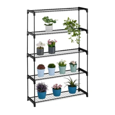 AmazonPractical: Black plant rack with 5 shelves for displaying your flowers and potted plants Indoor: The plant shelf is great for herbs in the kitchen - perfect for living room or conservatory Assembly: The plant stand is quick and easy to set up without drilling thanks to plug in system Design: Sleek steel and plastic plant shelving unit with grid shelves complements any space Basics: Plant rack is quick to set up with a plug-in system - Size HxWxD: approx. 140 x 91 x 28 cm