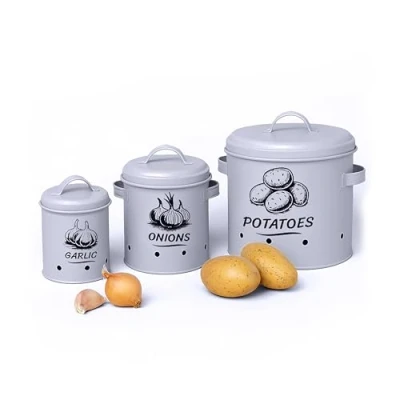 General description The Relaxdays Potato Storage Box set includes three containers designed for optimal storage of potatoes, onions, and garlic. These boxes create ideal conditions by providing a dark and dry environment, effectively preventing sprouting. The decorative print design adds a striking feature to your kitchen while ensuring that your vegetables remain fresh for an extended period. Technical specifications Potato container dimensions (H x W x D): approx. 21 x 26 x 23.5 cm Weight: approx. 0.6 kg Onion container dimensions (H x W x D): approx. 19 x 18 x 14.5 cm Weight: approx. 350 g Garlic container dimensions (H x D): approx. 17 x 12 cm Weight: approx. 200 g Material: steel, iron Other information Includes: 1x potato storage box, 1x onion storage box, 1x garlic storage box Decorative items are not included in the delivery Ventilation holes in the base ensure optimal air circulation Practical handles for easy transport Lid with handle