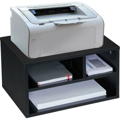 General description With this practical printer shelf, you not only give your printer a fixed place but also make good use of the space underneath. Printer paper, spare cartridges, and other office supplies can be neatly stored in the 3 different sized compartments, making the printer stand a clever accessory for any office. The simple and modern design blends well on the desk. Technical specifications Overall dimensions (H x W x D): approx. 22.5 x 40 x 30 cm Inner dimensions of small compartment (H x W x D): approx. 9 x 13.5 x 28.5 cm Inner dimensions of middle compartment (H x W x D): approx. 9 x 23 x 28.5 cm Inner dimensions of large compartment (H x W x D): approx. 9 x 37.5 x 28.5 cm Material: Fibreboard Colour: Black Weight: approx. 4.5 kg Load capacity upper shelf: approx. 8 kg Max. load middle and small compartment: approx. 3 kg each Load capacity large compartment: approx. 6 kg Installation Quick and easy to assemble Scope of delivery includes 1x printer riser in individual