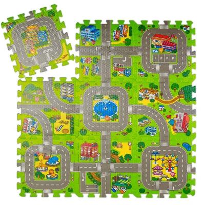 AmazonColourful: 9 children's mats with streets, buildings and animals - Floor mats to puzzle and play Large: Puzzle mats with 9 different designs - Floor puzzle for city motif W x D: approx. 90 x 90 cm Free from harmful substances: Independently tested play mat made of safe EVA foam - Without BPA Durable: Shock-absorbing play mat - Water-repellent children's play mat with cold protection Varied: Keep reassembling the road - Encourages the talent for combination