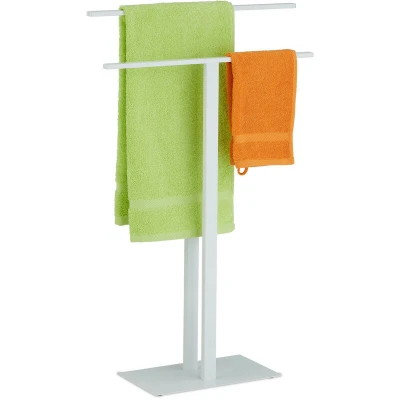 AmazonDesign: Towel rack with 2 bars in different heights - For small and large towels Modern: Metal towel rack in white - Quick and effortless to assemble without drilling - T-Design Versatile: Ideal for drying hand and shower towels in the bathroom or for clothes in the bedroom Free-standing: Freely positionable stand-up towel rack - Heavy base ensures secure footing Details: Bath towel rack dimensions H x W x D: approx. 82 x 50 x 19 cm - Total load: approx. 10 kg