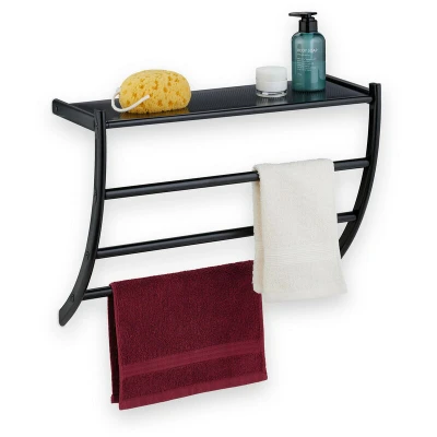 AmazonModern: Metal towel rack in plain, matt black - bathroom towel rail in semi-circular design Design: Towel rack with 3 tiered rails for towels - Provides excellent air circulation Space: Towel holder with shelf - keep cosmetics, fresh towels and much more within easy reach Assembly: Simply attach the towel rack to the wall in the bathroom - Mounting material included Basics: Dimensions H x W x D: approx. 44 x 56.5 x 23 cm - Shelf W x D: approx. 53.5 x 20 cm