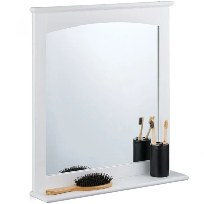 Functional and decorative, this wall mirror with a white frame seamlessly fits into your home decor. The hanging mirror can be effortlessly placed in the bathroom, bedroom, guest WC, or hallway. Thanks to its shelf, the mirror also serves as practical storage space. In the bathroom, you can place toothbrush holders and cosmetics on it. In the hallway, your keys are always within reach. You can also take a final glance in the mirror before leaving your home. Bathroom Mirror in Detail - Dimensions H x W x D: approx. 60 x 55 x 11 cm - Mirror surface H x W: approx. 48 x 45 cm - Shelf W x D: approx. 55 x 9.5 cm - Weight: approx. 3.7 kg - Material: MDF, glass - Colour: White Wall Mirror with Practical Shelf - White mirror with a wide frame fits seamlessly into various interiors - Wall mirror with a large surface for a full view - Features a shelf for toothbrush holders, cosmetics, decoration, and more - Versatile for use in the bathroom, guest WC, bedroom, hallway, etc. - Easy to mount on
