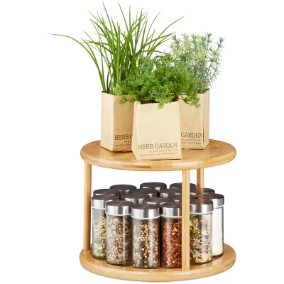 Relaxdays Revolving Spice Rack, Shelf Organiser, Cosmetic Stand, Kitchen Carousel, 2 Tier, HxW: 19.5 x 24.5 cm, Bamboo