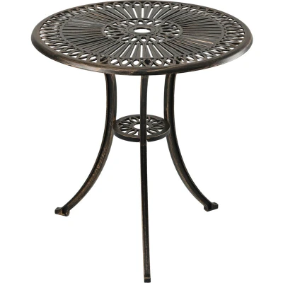 General description If you want to enjoy the gardening season to the fullest, this bistro table is a must-have. You can sit comfortably with family and friends at the balcony table, whether for barbecuing, drinking coffee, or simply enjoying the sun. The ornamental pattern makes this antique-style outdoor table a great eye-catcher in the garden, on the balcony, or on the terrace. Technical specifications Dimensions H x D: approx. 65 x 60 cm Umbrella hole diameter: approx. 45 mm Load capacity: max. 60 kg Material: cast aluminium Other information Stable thanks to sturdy 3-leg frame with wide feet Weatherproof with powder coating Included in delivery: 1x veranda table in individual parts, instructions, and assembly materials (decorative items not included)