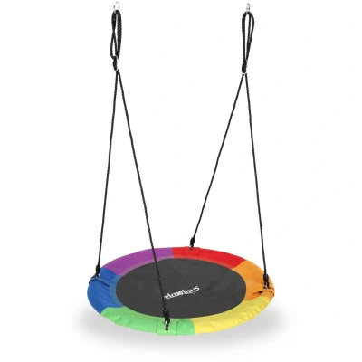 AmazonOutdoor swing: This round swing is suitable for garden, patio, camping grounds and indoors Basics: Nest swing with a diameter of app. 90 cm - Suitable for kids aged 3 and up - In various colours Adjustable: The ropes and thus height can be adjusted - App. 85 - 150 cm Lots of fun: Children and adults up to 100 kg can swing about with this lovely net swing Relaxed: Thanks to a comfortable lie down are and padded frame, this swing offers plenty of comfort for relaxation