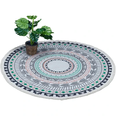 General description This soft, round rug with fringes provides a real feel-good experience. Made of 100% cotton, it is very pleasant on the feet and has a decorative effect, turning every room, whether bedroom or living room, into a real eye-catcher. With a diameter of 120 cm, the carpet runner does not take up much space, making it ideal for any home. Technical specifications Diameter: 120 cm Weight: 1 kg Material: 100% cotton Colours: Beige, Black, Green, Red Other information Non-slip boho rug with latex coating Can be used on floors with underfloor heating Professional dry cleaning recommended Included in delivery: 1x rug (decorative items not included)