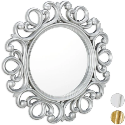 Relaxdays Round Wall Mirror, Decoration for Hallway, Bathroom, Living Room & Bedroom, Frame, Ornament, ∅ 50 cm, Silver