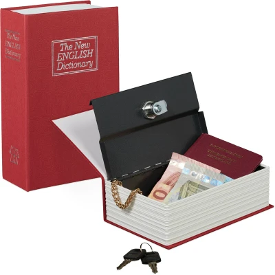 General description This book safe is a locking safe disguised as an English dictionary, allowing you to securely store valuables such as jewellery, cash, credit cards, or USBs. When placed on a bookshelf, it camouflages perfectly among other books, making it an ideal choice for travel. This book safe also serves as a creative gift option. Technical specifications Total size: approx 18 x 11.5 x 5.5 cm Size of safe compartment: approx 5 x 17 x 9.5 cm Weight: approx 0.4 kg Materials: Steel, cardboard, plastic Other information Includes 1x book safe and 2x keys Decorative items shown in product photos are not included