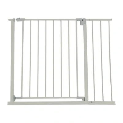 General description Protect your toddler from stairs and other hazards with this reliable safety gate designed for door frames, stair posts, and passageways. The gate fits openings measuring 75–80 cm and is installed using clamp screws, eliminating the need for drilling. For wider openings, you can use the gate extension for an additional 7 or 20 cm of space. This gate swings both ways and can be easily opened and closed with one hand, even while holding a baby. Technical specifications Height: 76 cm Width without extension: approx. 75–80 cm Width with 7 cm extension: approx. 82–87 cm Width with 20 cm extension: approx. 95–100 cm Material thickness (depth): approx. 1 cm Material: metal, plastic Installation Quick and damage-free installation using clamp screws Must not be fitted to windows Never use without clamp screws (mounting plates) Usage Ideal for securing specific areas and stairs Protects children up to 24 months from falls and other dangers Opens from both sides with easy