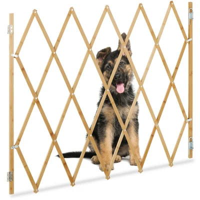 With the extendable dog guard, you can protect your four-legged friend from stairs and possible danger spots in the home. To keep your dog out of certain rooms, simply attach the dog guard to the door frame or wall with the enclosed mounting material. The stair guard made of robust bamboo is suitable for both narrow and wide doors and stairs, as it can be flexibly adjusted in width. Dog barrier in detail - Height: approx. 87.5 - 100 cm - Width: approx. 17 - 130 cm - Bars W: approx. 2 cm - Clearance between bars H x W: approx. 37 x 22 cm - Weight: approx. 1.4 kg - Material: Bamboo, iron - Colour: Natural Extendable safety gate for dogs - Block off certain rooms or stairs for four-legged friends - Protect dogs from dangerous places in the home - Extendable stair gate for narrow and wide places - Securely attach to the wall with enclosed material - Can be pushed together to save space thanks to the accordion design - Door guard without threshold and dangerous tripping hazard Included in