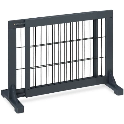 If you want to protect pets or children from stairs and doors or block off certain areas of the home for your dog, you can do this with this extendable wooden gate. Thanks to its variable width, the free-standing children's door gate is suitable for both narrower and wider passages. With the 2 foot positions, you can also individually adapt the dog gate to the area to be closed off. The rubber pads protect your floor from unsightly scratches. Barrier grille in detail - Overall dimensions H x W x D: approx. 56 x 70-115 x 32 cm - Dimensions per grid element H x W: approx. 41.5 x 56.5 cm - Grid spacing H x W: approx. 14 x 4 cm - Weight: approx. 3.5 kg - Material: Pine wood, steel - Colour: Grey Extendable stair guard for children and pets - Use to protect pets or children - Set up as a barrier on stairs or doors - Individual protection thanks to adjustable width and 2 stand positions - Freestanding, can be placed flexibly without drilling - With floor protectors to prevent scratches on