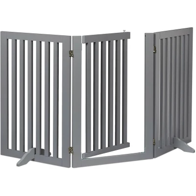 AmazonSafety: Grey stairs-, doors- and fire barrier to protect dogs and children in home approx. 70 cm Flexible: 3-part protective barrier can be set up in various positions - Max. width: approx. 154 cm Versatile: Sturdy safety fence for children and pets can be put anywhere. - With practical door Compact: If not in use, you can simply stow the safety gate away thanks to its folding function Basics: Free-standing stair gate made of firm MDF - Includes 2 stable feet with floor protectors