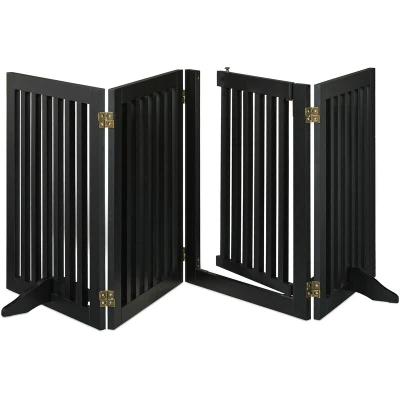 AmazonSafety: Black stairs-, doors- and fire barrier to protect dogs and children in home approx. 70 cm Flexible: 4-part protective barrier can be set up in various positions - Max. width: approx. 207 cm Versatile: Sturdy safety fence for children and pets can be put anywhere - With practical door Compact: If not in use, you can simply stow the safety gate away thanks to its folding function Basics: Free-standing stair gate made of firm MDF - Includes 2 stable feet with floor protectors