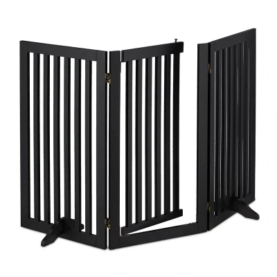 AmazonSafety: Black stairs-, doors- and fire barrier to protect dogs and children in home app. 92 cm Flexible: 3-part protective barrier can be set up in various positions - Max. width: app. 154 cm Versatile: Sturdy safety fence for children and pets can be put anywhere. - With practical door Compact: If not in use, you can simply stow the safety gate away thanks to its folding function Basics: Free-standing stair gate made of firm MDF - Includes 2 stable feet with floor protectors