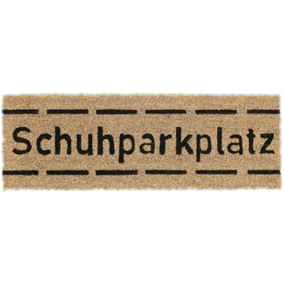 General description This unique doormat features the German text "Schuhparkplatz" (meaning shoe parking spot) print, designed to bring a smile to your guests' faces before they even enter your home. It is suitable for both indoor and outdoor use, helping to keep dirt out of your living space. Technical specifications Dimensions (H x W x D): approx. 1.5 x 75 x 25 cm Weight: approx. 1.1 kg Materials: Coir fibre, PVC Colour: Natural Coir, black Other information Non-slip PVC bottom ensures the doormat stays firmly in place Made from robust, weatherproof coir fibres Coir fibre is a natural material and may vary slightly in structure and colour Included in delivery: 1x Doormat (decorative items not included)