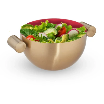 General description This elegant metal bowl is perfect for serving salads, crisps, or other snacks. Its stylish red and gold design makes it a great focal point on any table. Additionally, it serves as an excellent mixing bowl for baking or food preparation. Technical specifications Material: Stainless steel Color: Gold, red Size S: H x W x D: approx. 8.5 x 20.5 x 15 cm, Weight: approx. 300 g Size M: H x W x D: approx. 10.5 x 25 x 20 cm, Weight: approx. 400 g Size L: H x W x D: approx. 12.5 x 30 x 24.5 cm, Weight: approx. 500 g Capacity: approx. 1 litre / 2 litres / 3.5 litres Usage Ideal for serving salads or snacks Can be used as a mixing bowl when baking Easy to clean by hand after use Other information Not suitable for microwave or dishwasher Included in delivery: 1 x serving bowl in choice of size (decorative items not included)
