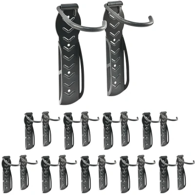 AmazonPractical set of 10: For 10 bikes - Suitable for all standard bicycle types For wall-mounting: Stores 1 bike each horizontally - Secure hold Robust and weather-resistant: Made of sturdy steel - Max. capacity per hook: approx 25 kg Tyre protection: Holder with protective plastic coating - Protects tires from scratches Space-saving storage: Size per hook: approx 26.5 x 10 x 12 cm - For tyre widths up to 5 cm