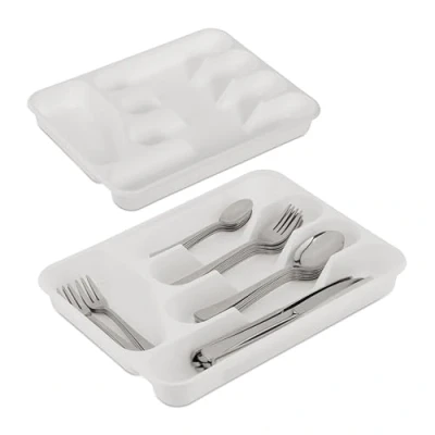 General description These 2 cutlery trays are the optimal kitchen accessory for organizing and sorting knives, forks, spoons, and other kitchen utensils. Each practical cutlery drawer provides ample space for a variety of cutlery in the 5 compartments. The organizers can also be used for stationery, make-up accessories, or craft and sewing supplies. The drawer inserts are made of plastic, making them both robust and easy to clean. Technical specifications Total size H x W x D: approx. 4 x 24.5 x 32.5 cm Small compartments H x W x D: approx. 3.5 x 5 x 22 cm Medium compartment H x W x D: approx. 3.5 x 5 x 24.5 cm Large compartment H x W x D: approx. 3.5 x 5 x 31 cm Wide compartment H x W x D: approx. 3.5 x 10-17 x 5-8 cm Weight: approx. 130 g each Material: Plastic (PP) Colour: White Other information Included in Delivery: 2 x cutlery drawer insert Decorative items are not included in delivery Tip: Measure your drawer precisely to ensure that the cutlery tray will fit
