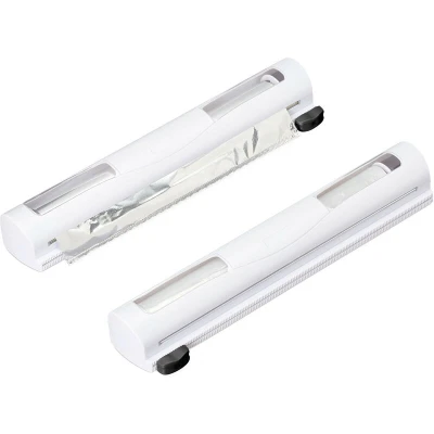 General description These practical foil cutters come in a set of 2 and are ideal kitchen helpers, designed for easy handling. Simply insert the aluminium foil or cling film into the cutter, pull out the desired length, and move the slider to cut the film cleanly and smoothly. The roll width can be adjusted variably to accommodate different sizes. Technical specifications Dimensions (H x W x D): approx. 5 x 37 x 8 cm Max. roll width: approx. 31.5 cm Max. roll diameter: approx. 4.5 cm Weight: approx. 230 g Material: PP, metal Colour: white, black Compatibility and accessories Includes 2 pieces for standard cling film and aluminium foil Installation Can be attached without drilling using 4 strong magnets Adheres to metal surfaces such as refrigerators Usage Easy and convenient to refill thanks to hinged lid Viewing window provides a quick overview of remaining film