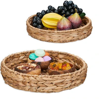 Relaxdays, Set of 2, Round Serving Trays, Size Ø 32 & 25 cm, Decorative Organisers, Made Water Hyacinth, Natural, Plant fibre, 7 x cm