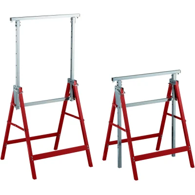 General description The Relaxdays Set of 2 Sawhorses is a versatile and sturdy solution for various DIY projects. Whether you're cutting wood, painting, or gardening, these multipurpose trestles provide reliable support. Made from durable powder-coated steel, they are designed to withstand heavy use and last for years. Technical specifications Dimensions (H x W x D): approx. 130 x 58 x 58 cm each Height settings: approx. 79, 80, 90, 100, 110, 120, 130 cm Folded dimensions (H x W x D): approx. 79 x 58 x 22.5 cm each Max. load: approx. 200 kg Weight: approx. 5 kg each Material: Steel Colour: Red, Silver Installation Assembly required: Yes Included in delivery: 2 x sawhorse to be assembled, assembly materials, and instructions Usage Ideal for DIY projects, building sites, and painting work Can be used as a table by placing a sheet of wood on top Height adjustable with safety bolts for secure positioning Folds away easily for convenient storage