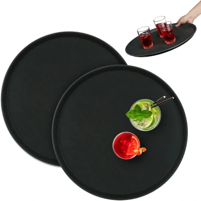 AmazonGastronomy: Waiter tray in set of 2 for serving drinks and food - For restaurant, bar, café etc. Non-slip: Bar tray with anti-slip coating - Prevents glasses from tipping over during transport Practical: Round gastro tray with raised rim - Dishes stay safely on the tray without sliding Versatile: Tray for the next cocktail evening at home, birthday or other private celebrations Basics: Black serving tray made of robust plastic and rubber - Overall dimensions HxØ: 2 x 45 cm