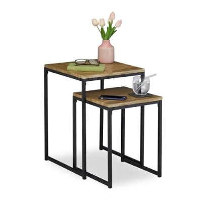 Relaxdays Set of 2 Side, Nesting, Industrial Design, Sizes, Coffee Table, Square, Metal, Wood Effect/Black, 54 x 40 cm