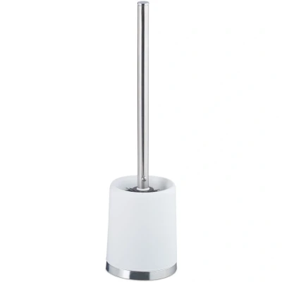 General description Unlike mounted toilet brush holders, you can flexibly position this freestanding WC accessory set in your bathroom. The matt surfaces of the brush handle and plastic holder create a harmonious and decorative look. Even if your brush head becomes worn out, you can easily exchange it for a new one without needing to replace the entire set. The holder is easy to clean; simply rinse it with a damp cloth. Technical specifications Total dimensions (H x Diameter): approx. 37.5 x 10 cm Toilet brush holder dimensions (H x W x D): approx. 12 x 10 cm Brush dimensions (H x D): approx. 34 x 7 cm Materials: Metal, PP Weight: approx. 160 g Colour: White Compatibility and accessories Replacement brush head diameter: approx. 7 cm Replacement brush head inner thread: approx. 17 mm Other information Included in delivery: 2 x Toilet Brush & Holder Decorative items shown in product photos are not included