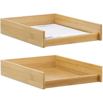 Relaxdays Set of 2 Wooden Document Filing Trays, Stackable, DIN A4 Letter Rack, Flat, Desk, Bamboo, 6x25x33 cm, Natural