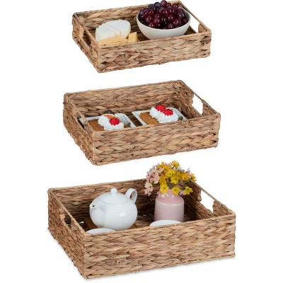 Relaxdays, Set of 3, Serving Tray with Handles, Woven Decorative Basket, Water Hyacinth, Square, Natural, Plant fibre, Various sizes