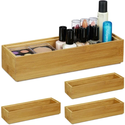AmazonSet of 4: Organiser box for additional storage space - H x W x D: approx. 5 x 23 x 7.5 cm Versatile: Natural storage box for cosmetics, stationery supplies, crafting item and more Stackable: The edges are standardized so you can stack multiple boxes Decorative: Warm wooden tones and natural grain exudes a soothing ambience anywhere Bamboo: The box is made of sustainable bamboo - Moisture-resistant material