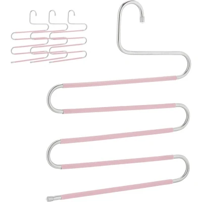 Relaxdays, Set of 4 Multi Trouser Hangers, S Shaped, 5 Rails, Non Slip, Space Saving Pants Holder, Metal, Silver/Pink, Stainless steel, 38 x 32.5 1 cm