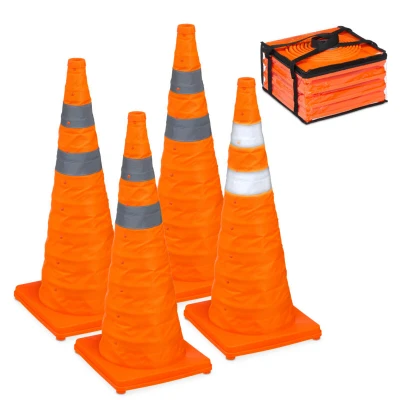 General description Discover our set of 4 foldable traffic cones - practical and versatile! The warning cones can be folded up to save space and come in a handy carry bag. In a bright orange color and fitted with two reflective strips, they ensure excellent visibility, even in the dark. Whether for cordoning off car parks, marking construction sites, or warning of danger spots, these markers always ensure safety. The collapsible cones are also ideal as training accessories, suitable for football, equestrian sports, dog training, or slaloms. Technical specifications Dimensions per cone (H x W x D): approx. 70 x 29 x 29 cm Height when folded: approx. 5 cm Dimensions in bag (H x W x D): approx. 9 x 30 x 30 cm Total weight: approx. 2.6 kg Material: Polyester, plastic Color: Orange, silver Usage Ideal for cordoning off areas, marking construction sites, and warning of danger zones Multifunctional for traffic training, running courses, and playing field boundaries Suitable for sports