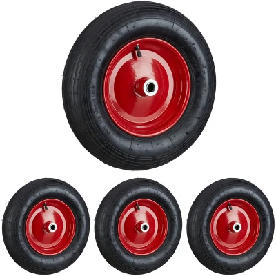 If you need a new wheel for your garden wheelbarrow, get the wheelbarrow wheel 4.80 4.00-8 with pneumatic tyres for optimum driving comfort. Thanks to its pneumatic tyres with steel rims, the complete wheel is not only manoeuvrable but also absorbs shocks well. Ball bearings and a profiled tread also make it easier to push the trolley even when it is heavy. Inflation is quick and easy with the car valve. The sturdy wheel has a classic black colour and a steel rim in an eye-catching red. The spare wheel is suitable for standard wheelbarrows, sack trucks or handcarts. Wheelbarrow wheel with pneumatic tyres in detail - Tyres: 4.80 4.00-8 - Wheel diameter: approx. 39 cm - Wheel width: approx. 9 cm - Dynamic load capacity: approx. 120 kg - Static load capacity: approx. 200 kg - In a set of 4 Spare wheel without axle - Axle inner diameter: approx. 2 cm - Hub length: approx. 9 cm - Rim diameter: approx. 22 cm - Material: Rubber, nylon, steel - Colour: Black-red Pneumatic rubber tyres