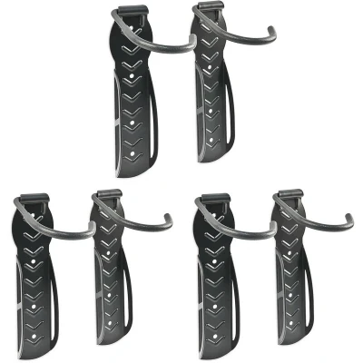This bicycle stand offers you the possibility to store your bicycle in a space-saving manner in your garage or basement. Front or rear wheels can be hung on the holding bracket. Use the included screws and wall plugs to quickly mount the holders to the wall. A practical plastic coating protects your bike tyres from scratches, and the holders are suitable for tyre widths up to about 5 cm. Note: Check the width and depth of the rim and tyre for compatibility with the bracket. Please note that the hooks are not hinged. Details on the Bike Rack - Size: approx. 10 x 26.5 x 12 cm each - Loading capacity: approx. 25 kg each - Holder for tyres up to about 50 mm wide - Material: Sheet steel - Weight: approx. 0.46 kg each (1 lbs) Bicycle Wall Hooks - Suitable for nearly all bicycle sizes, types and models - A bicycle-protecting and space-saving storage solution for 6 bikes - Holding brackets coated with a plastic cover to protects the wheels - Holding brackets include a lateral guide for a safe