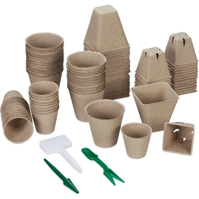 Relaxdays Set of 96 Growing Pots in Different Sizes, Including Accessories, Biodegradable, Planting, Propagation, Brown, Paper, 8 x cm