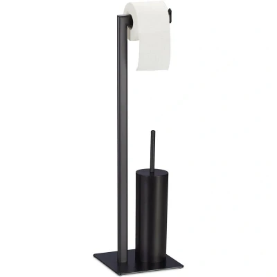 General description With this chic toilet butler, you always have toilet paper and a toilet brush at hand. Whether in the bathroom or guest toilet, the free-standing toilet set can be placed flexibly and does not need to be attached to the wall. The modern design of the black steel toilet stand will be a great eye-catcher in your bathroom. Technical specifications Dimensions (H x W x D): 72.5 x 20 x 20 cm Stand dimensions (W x D): 20 x 20 cm Weight: 1.9 kg Material: Steel, plastic Color: Black Toilet brush holder dimensions (H): 25.5 cm Toilet brush dimensions (H x D): 37 x 9 cm Toilet roll holder dimensions (W): 13 cm Compatibility and accessories Replaceable brush head with a diameter of about 7 cm and an internal thread of about 9.5 mm (e.g., Relaxdays brush head model 10021023) Installation Includes instructions and assembly material Usage Practical combination of paper and brush holder Hygienic with easily replaceable brush head Stable stand due to its own high weight Protective