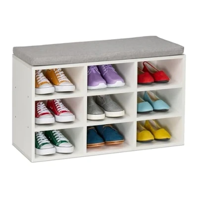 Relaxdays Shoe Bench, 9 Compartments, 49.5x80x31 cm, Padded Seat, for Hallway & Bedroom, Footwear Storage, White/Grey