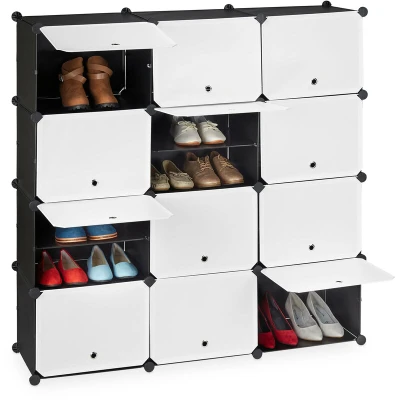Relaxdays Shoe Cabinet, Storage with Doors, HWD: 125x125x32 cm, 24 Compartments, Plastic Shelving System, Black&White