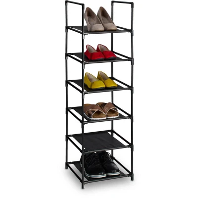 AmazonStorage space: Shoe storage for 1 pair of shoes on each level - ideal for your flat footwear Details: Shoe rack with 6 levels - dimensions HxWxD: approx. 106 x 33 x 33 cm - simply slot together Space-saving: Narrow shoe rack suitable for any niche - for hallways, cloakrooms and dressing rooms Design: Black metal shoe rack with fabric shelves - simple look for many interiors Practical: Open shoe rack for easy, quick access and a good overview of all shoes