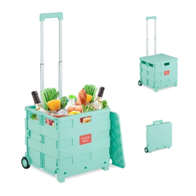 General description The Relaxdays Shopping Trolley is the perfect companion for your shopping trips. With its large capacity and high load limit, this foldable trolley provides ample space for your purchases, while the practical lid protects them from the elements. Thanks to the wheels and telescopic handle, you can comfortably pull the trolley behind you without straining your back. After use, the transport trolley can be easily folded up and stowed away to save space. Technical specifications Dimensions with handle (H x W x D): approx. 99 x 45.5 x 37.5 cm Telescopic handle heights: approx. 46 cm, 73.5 cm, and 99 cm Box dimensions without handle (H x W x D): approx. 40 x 45.5 x 37.5 cm Internal dimensions (H x W x D): approx. 34.5 x 38.5 x 32 cm Folded dimensions (H x W x D): approx. 47 x 42.5 x 10 cm Weight: approx. 2.7 kg Volume: approx. 50 litres Load capacity: approx. 35 kg Material: PP plastic, aluminium, rubber Other information Back-friendly alternative to bags Stable base