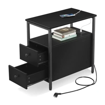 Storage: side table with 2 shelves and 2 drawers for books, lamps, etc. – always at hand Appearance: Black MDF side table in wood look with metal legs – ideal for modern interiors Practical: side table with sockets and USB ports – charge devices directly. Versatile: Use as a side table by the sofa or desk, or as a nightstand in the bedroom Details: Nightstand dimensions HxWxD: 61 x 35 x 60 cm - Easy assembly with instructions.
